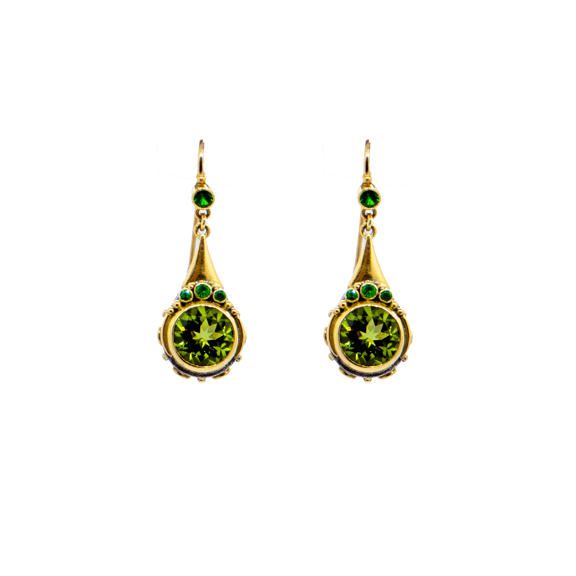 Peridot drop earrings with green Garnets set in 22ct Gold with 18ct Gold hooks for strength and durability -BN187
