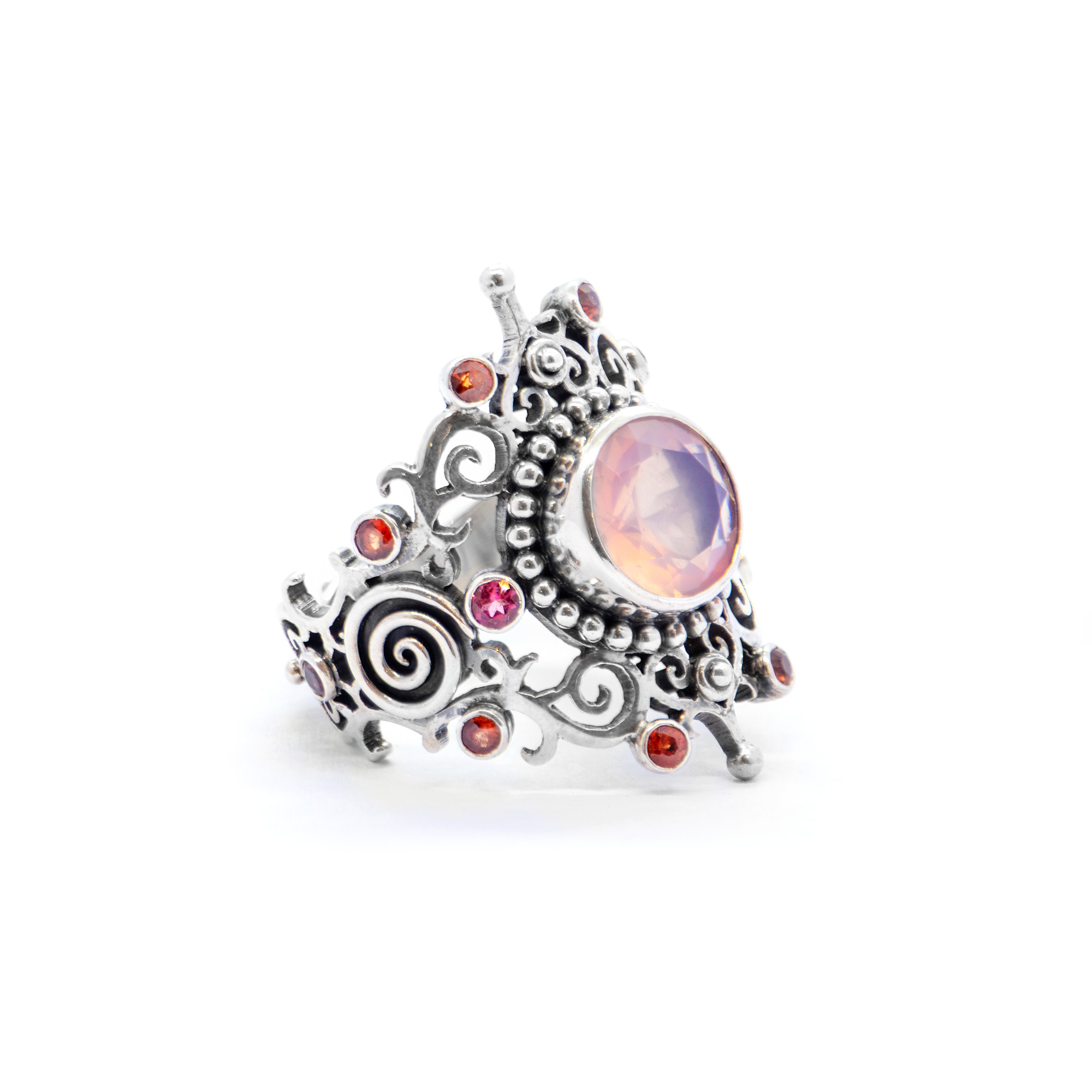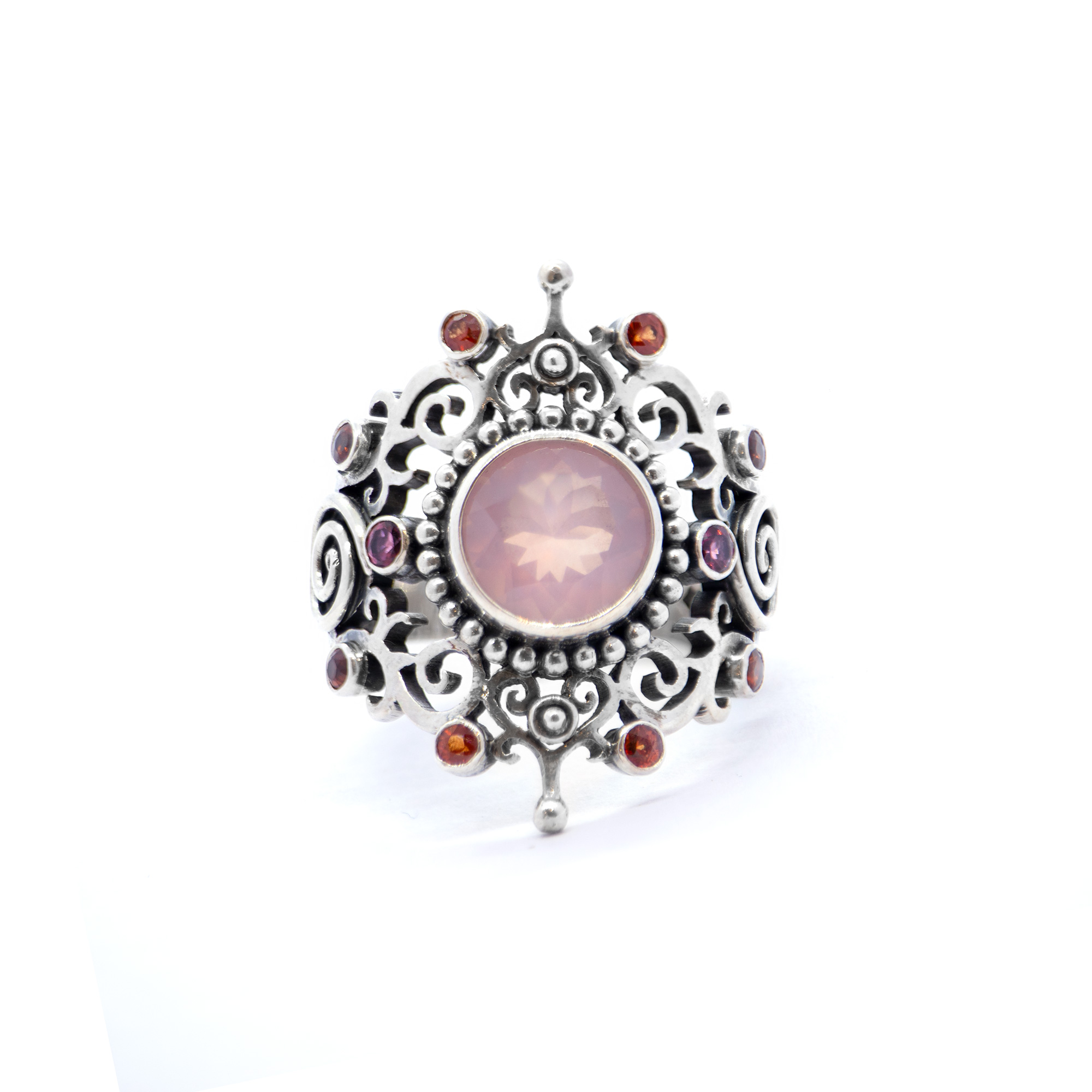 Rosequartz Jali ring with pink tourmalines and orange sapphires, Sterling Silver -BN201